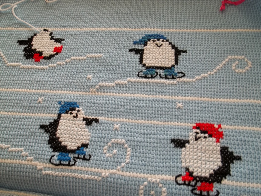Pingouins brodés au point de croix sur crochet tunisien, Nancy